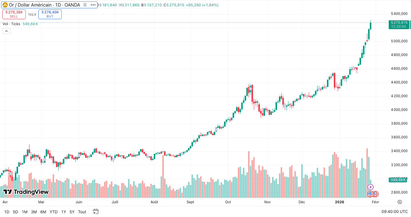 Ce matin, l'or a franchi les 5 300$ l'once.