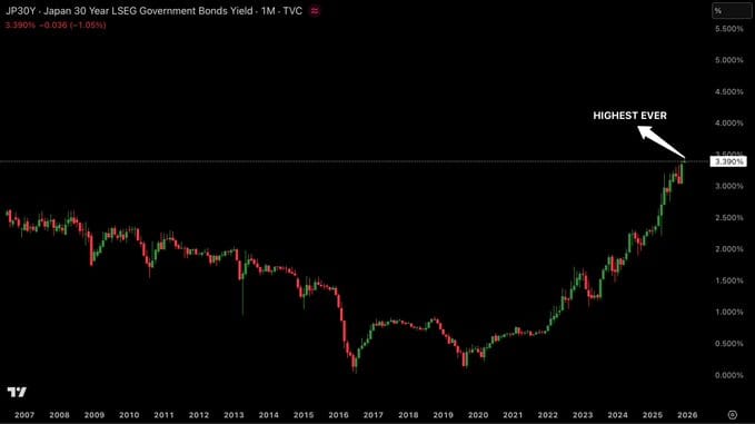 Les obligations japonaises à 30 ans viennent d'atteindre 3,43%. Record historique. Les obligations à 10 ans sont au plus haut depuis 18 ans. Les obligations à 20 ans près d'un plus haut de 26 ans.