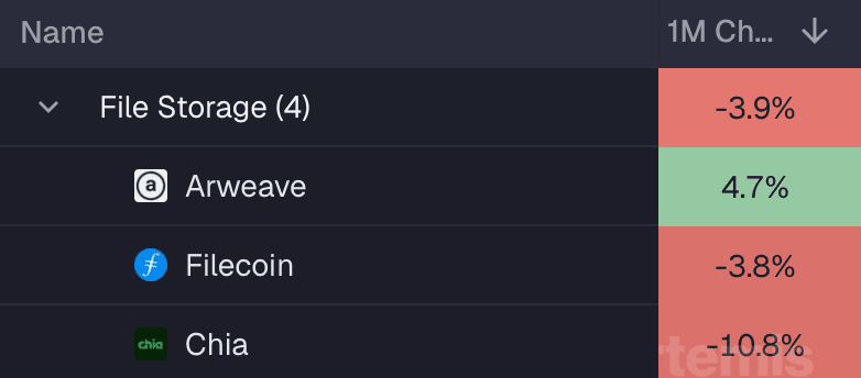 Le stockage décentralisé s'en sort relativement bien. Arweave limite les dégâts avec +4,7% pendant que Filecoin et Chia reculent.