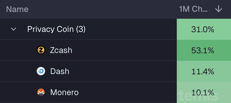 Les privacy coins écrasent la concurrence ce mois-ci avec Zcash qui explose à +53%. Personne ne sait vraiment d'où vient cette tendance ni où elle va, mais au moins un secteur affiche du vert.