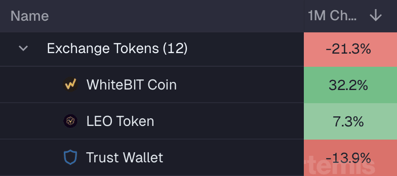 Le pire secteur du top 5. WhiteBIT Coin explose à +32% mais quelques tokens peu connus tirent l'ensemble vers le bas. LEO Token reste positif à +7,3%.