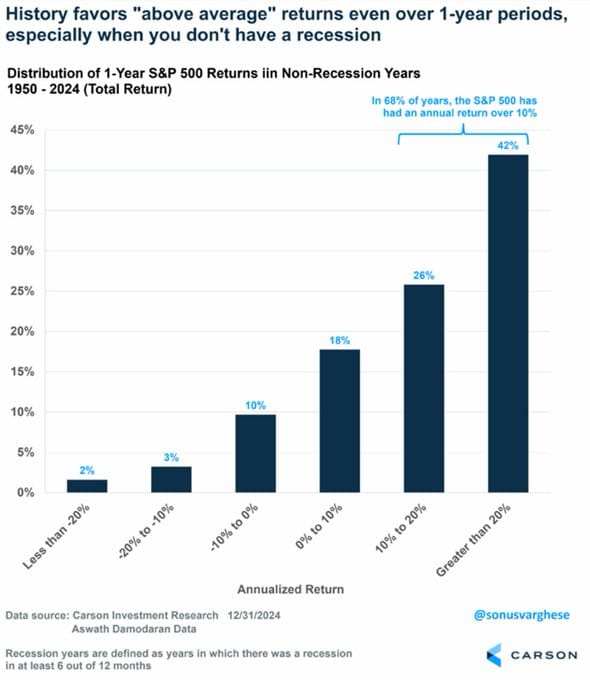 Ce qu'il faut retenir : Sans récession, le marché monte dans 85% des cas historiquement. 2026 ne devrait pas connaître de récession grâce aux baisses de taux et aux stimulus. Parier sur un bear market prolongé en 2026 va à l'encontre des statistiques historiques.
