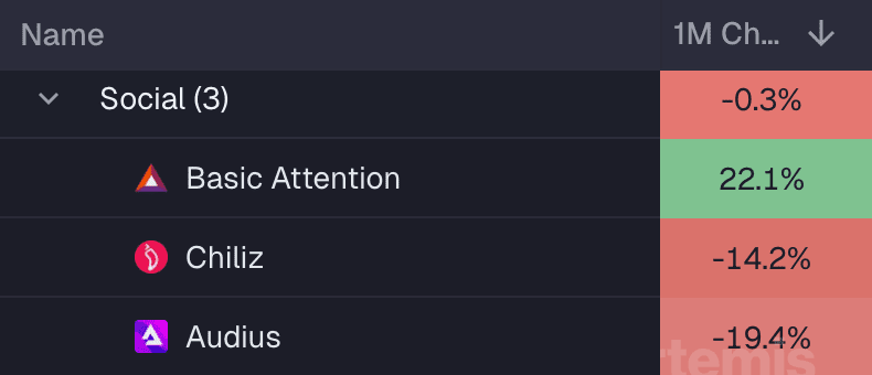 Les pertes compensent presque exactement les gains, ce qui est plutôt impressionnant dans le contexte actuel. Basic Attention à +22% tire le secteur vers le haut tandis que Chiliz et Audius plombent la moyenne.