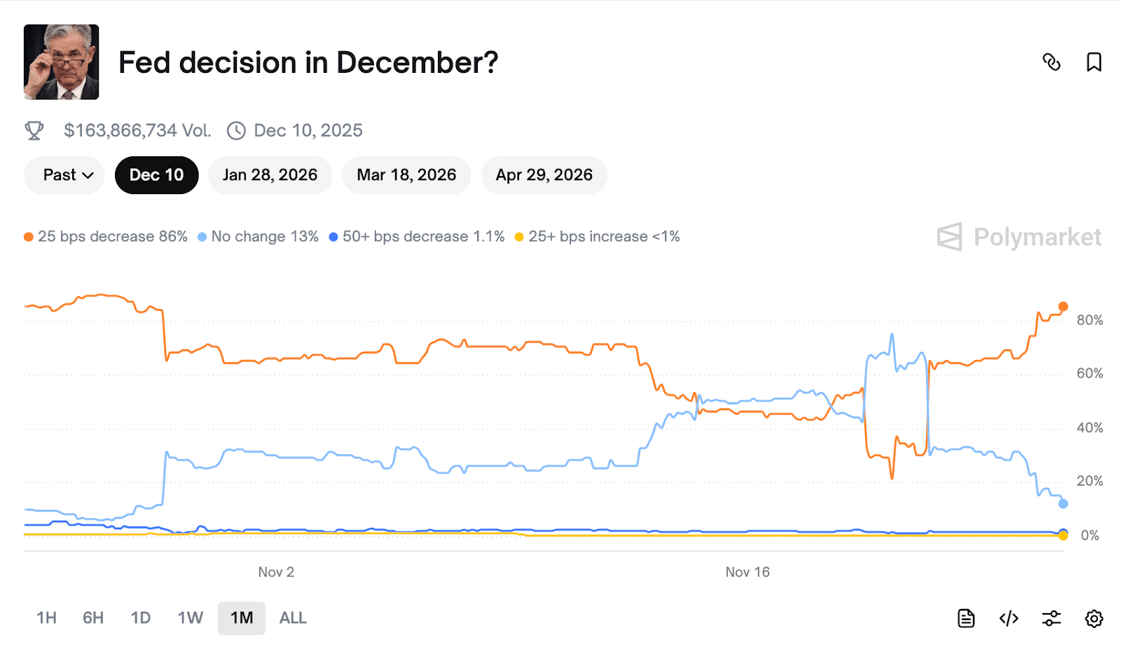 Il y a 4 jours, nous avions 76% de chances de ne pas avoir de baisse de taux en décembre. Aujourd'hui, nous avons 86% de chances d'avoir une baisse de 0,25%. Un renversement complet.