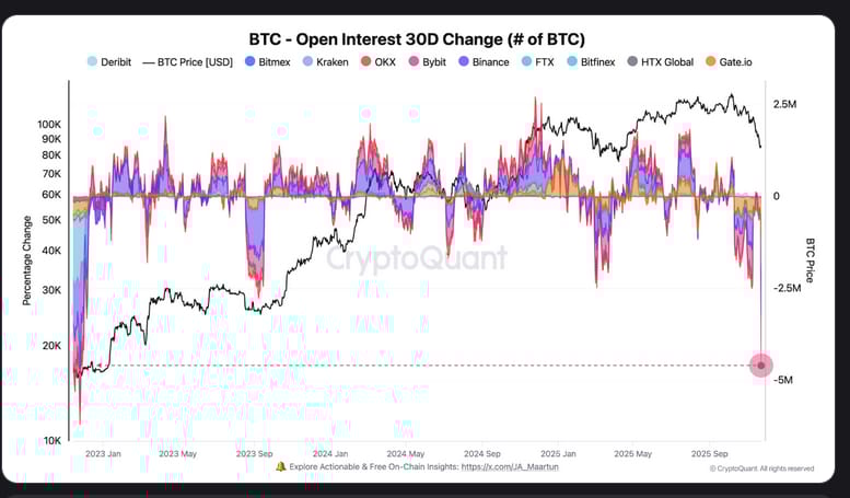 En un mois, l'open interest a chuté de 1,3 million de BTC, soit 114 milliards de dollars. C'est la baisse la plus brutale de tout le cycle haussier actuel.