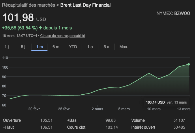 De l'autre, le pétrole flambe. Le Brent (le prix de référence du pétrole mondial) est à 101$. Et il ne va pas redescendre de sitôt.