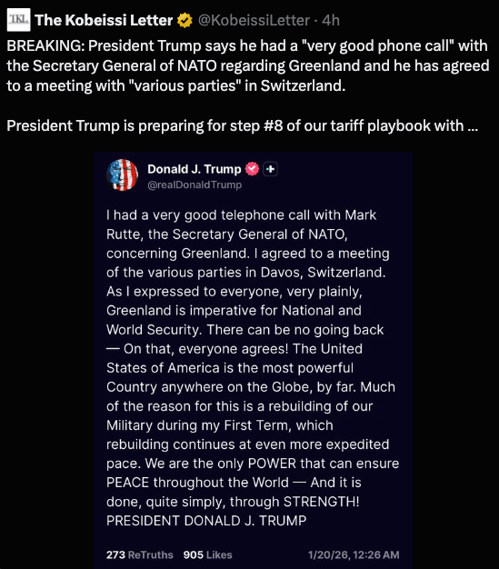 Trump appelle l'OTAN. Réunion prévue en Suisse sur le Groenland. On passe à la phase de négociation. La récupération commence.