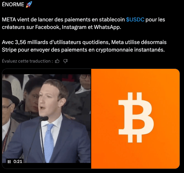 Cette nuit : Meta lance des paiements en USDC (le stablecoin de Circle, le concurrent de Tether) pour les créateurs sur Facebook, Instagram et WhatsApp. Via Stripe. 3,56 milliards d'utilisateurs quotidiens potentiels.